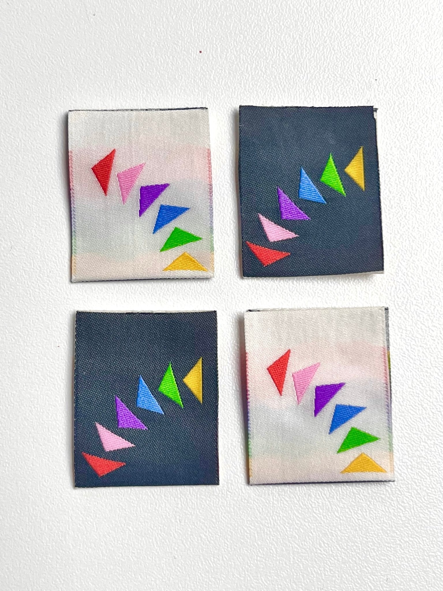 These woven labels are perfect for sewing into your handmade clothes, into quilt bindings, into your handmade bags and pouches, and more! These rainbow flying geese labels are doublesided - ivory on one side, charcoal on the other.