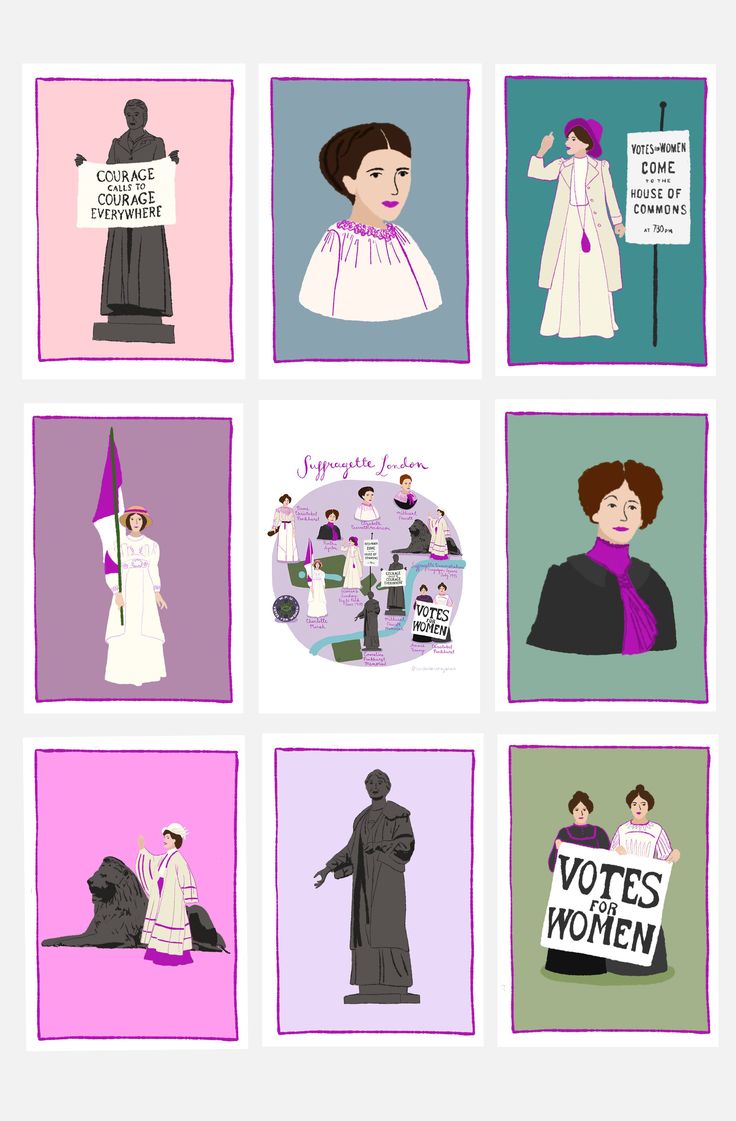 A wonderfully illustrated set of 9 x A6 Cards (105mm x 148mm) featuring images of sufragettes from the iconic brand london-block-by-block.